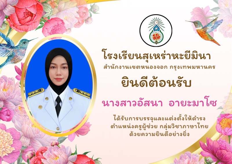 #โรงเรียนสุเหร่าหะยีมินา โดย ผอ.พิมวรา บุญศรี ขอแสดงความยินดีและยินดีต้อนรับ ครูอัสนา อายะมาโซ ครูรัชณาภรณ์ ควรอนุสร และครูนัชญาลี หวังและ เนื่องในโอกาสได้รับการบรรจุและแต่งตั้งให้ดำรงตำแหน่งครูผู้ช่วย โรงเรียนสุเหร่าหะยีมินา |
