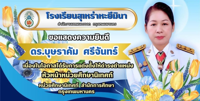 ขอแสดงความยินดีกับ ดร.บุษราคัม ศรีจันทร์ เนื่องในโอกาสรับการแต่งตั้งให้ดำรงตำแหน่ง หัวหน้าหน่วยศึกษานิเทศก์ สำนักการศึกษา กรุงเทพมหานคร