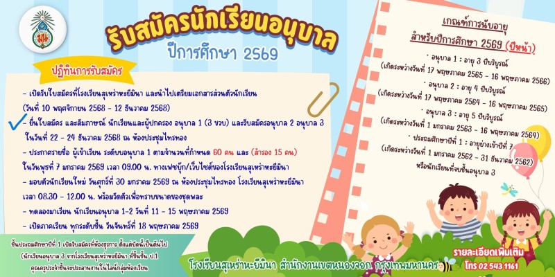 วันที่ 22-24 ธันวาคม 2568 นักเรียนอนุบาลยื่นใบสมัคร ประเมินเด็ก และสัมภาษณ์ผู้ปกครอง 8.30-15.30 น.