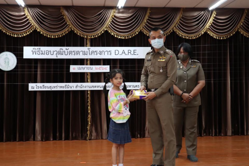 โรงเรียนสุเหร่าหะยีมินา โดย ผอ.ศักดิ์ดา ลาวัง ผู้อำนวยการสถานศึกษาโรงเรียนสุเหร่าหะยีมินา นายวิลัน ทำไร่ ศึกษานิเทศก์ชำนาญการ สำนักการศึกษา กรุงเทพมหานคร ร่วมกับ สน.หนองจอก โดย พ.ต.อ.ประเสริฐ สอนแจ่ม ผกก.สน.หนองจอก พร้อมด้วย ตำรวจครูแดร์ ในโครงการ D.A.R.E. ( Drug Abuse Resistance Education ) เป็นโครงการการศึกษาเพื่อต่อต้านการใช้ยาเสพติดในเด็กนักเรียน และทำพิธีปิดกิจกรรม D.A.R.E. ประจำปีการศึกษา 2563 และยังมอบขนมให้กับนักเรียน ณ ห้องประชุมไทรทอง โรงเรียนสุเหร่าหะยีมินา วันที่ 1 เมษายน 2564 |
