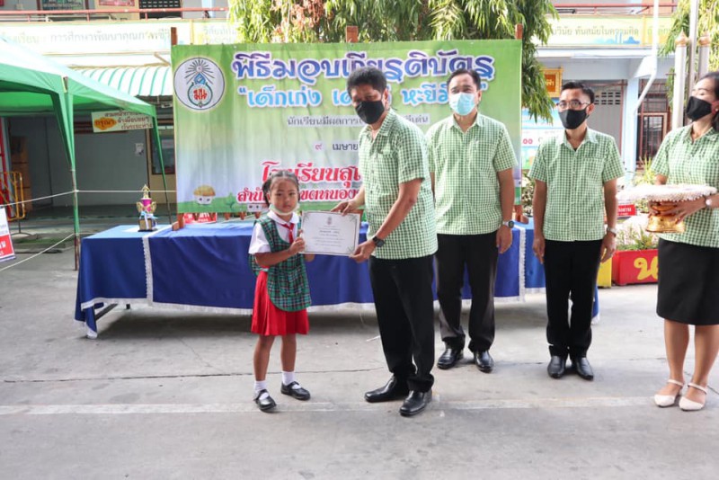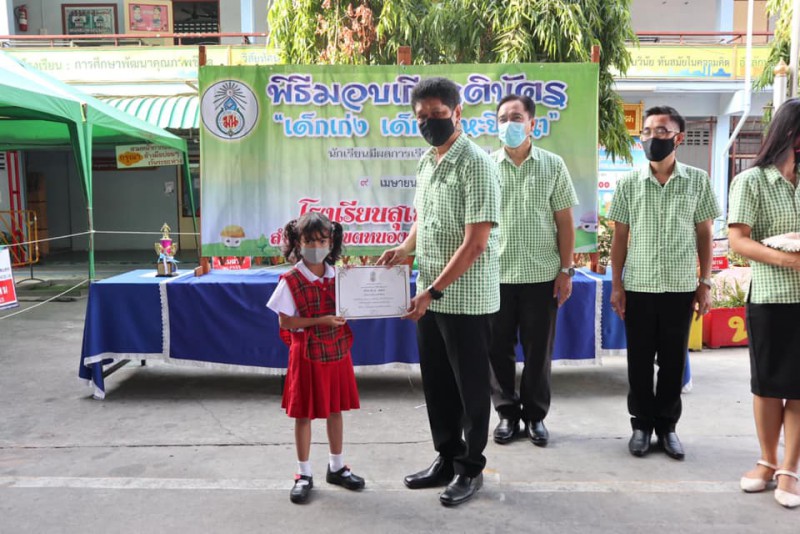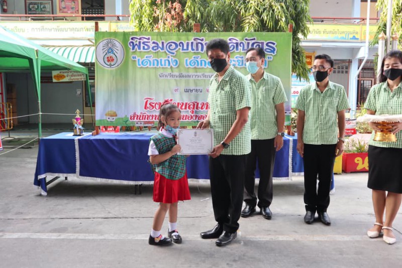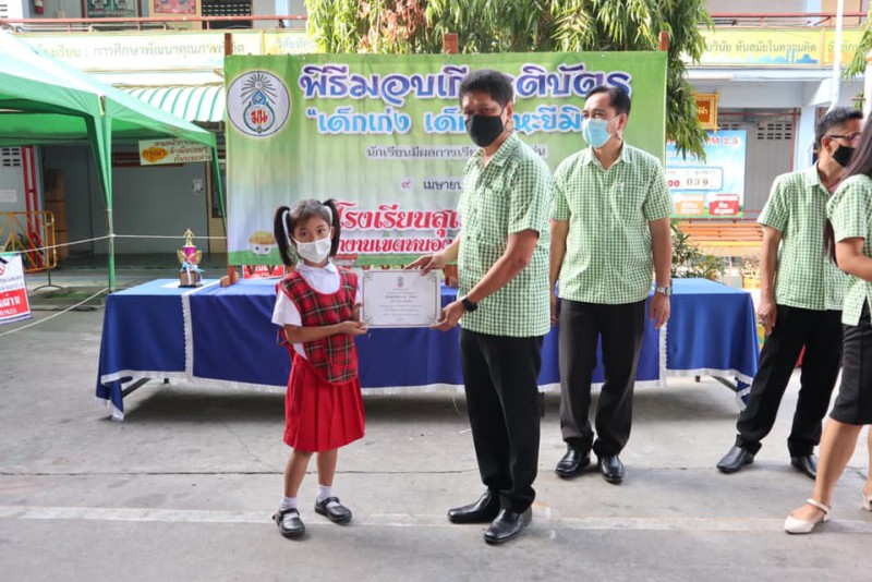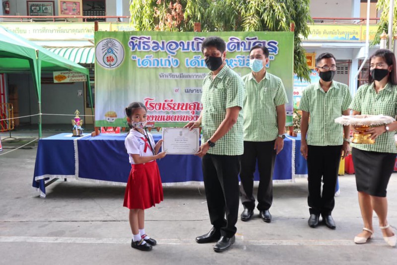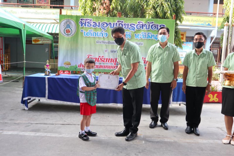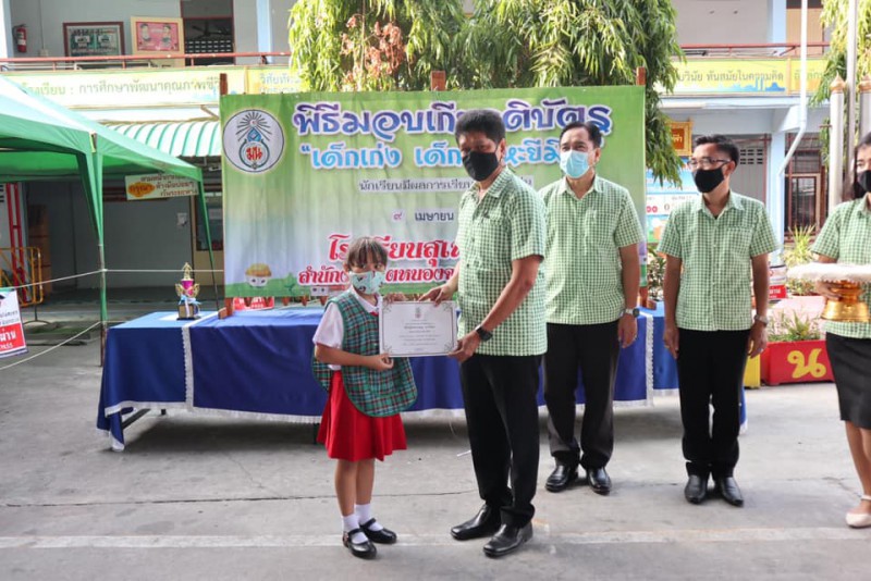 มอบเกียรติบัตรแก่นักเรียนที่ได้คะแนน 100 คะแนน ในระดับอนุบาล และนักเรียนที่ได้ระดับผลการเรียน 4.00 ในระดับชั้นประถมศึกษาปีที่ 1 - 6