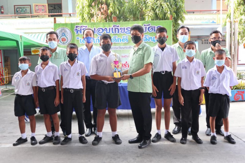 ผอ.ศักดิ์ดา ลาวัง มอบถ้วยรางวัลและแสดงความยินดีแก่นักเรียนที่ได้รับรางวัลการแข่งขัยฟุตซอล