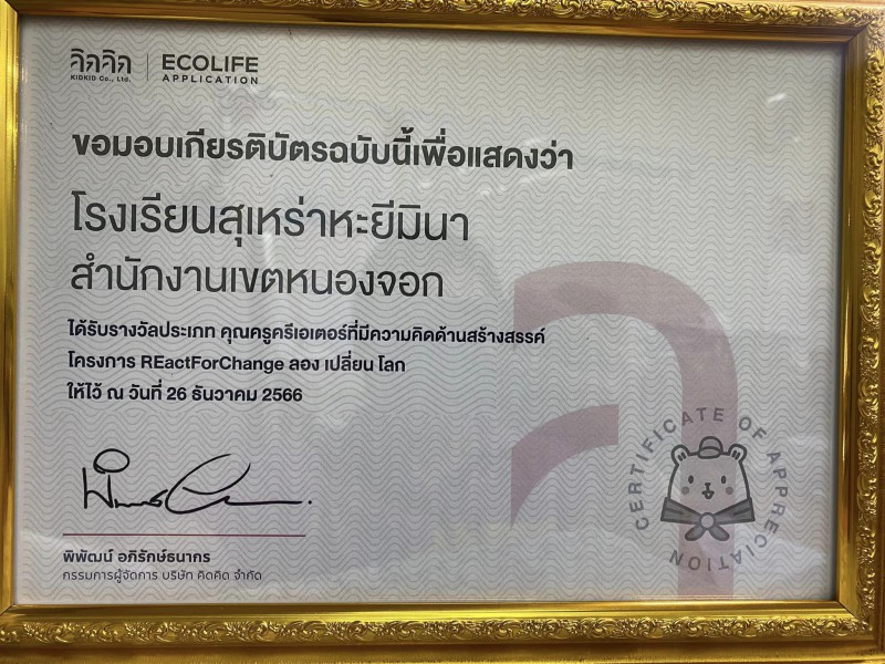 โรงเรียนสุเหร่าหะยีมินา โดย ผอ.วรรธนพร อรุณประเสริฐศรี พร้อมกับตัวแทนผู้บริหารและตัวแทนครู เข้ารับรางวัล “คุณครูครีเอเตอร์ที่มีความคิดด้านสร้างสรรค์” ในโครงการ REactForChange ลอง เปลี่ยน โลก โดย บริษัท คิดคิด จำกัด (วิสาหกิจเพื่อสังคม) ร่วมกับ บริษัท Tiktok และกรุงเทพมหานคร เพื่อขับเคลื่อนโรงเรียนปลอดขยะ และสนับสนุนโยบายการบริหารจัดการขยะ ณ ห้องประชุมศิรินาม สำนักการศึกษา กรุงเทพมหานคร วันที่ 17 มกราคม 2567 |