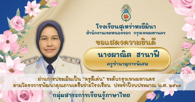 ขอแสดงความยินดีกับ คุณครูผาณิต ฮานาฟี ครูชำนาญการพิเศษ โรงเรียนสุเหร่าหะยีมินา ผ่านการประเมินเป็น “ครูดีเด่น” ระดับกรุงเทพมหานคร