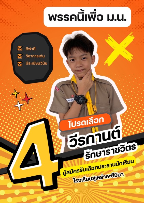 นางพิมวรา บุญศรี ผู้อำนวยการโรงเรียนสุเหร่าหะยีมินา มอบหมายรองธานี สมานตระกูล ดูแลความเรียบร้อยในการเลือกตั้งสภานักเรียน โดยมีครูกลุ่มสาระการเรียนรู้สังคมศึกษาเป็นแกนนำ การเลือกตั้งมี 2 หน่วยเลือกตั้งโดยผู้มีสิทธิ์ทั้งครูและนักเรียนชั้นประถมศึกษาร่วมลงคะแนน ผลการลงคะแนนประธานนักเรียนได้แก่หมายเลข 4 ด.ข.วีรกานต์ รักษาราชวิตร |