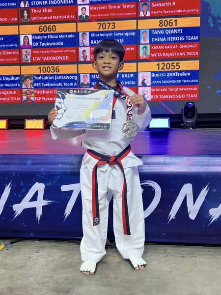 2. ด.ช. ธานินทร์ เจ๊ะเต๊ะ ได้รับรางวัล รองชนะเลิศอันดับ 1 เหรียญเงิน ประเภทต่อสู้ รุ่นอายุ 7-8 ปีชาย น้ำหนัก 24-27 k.