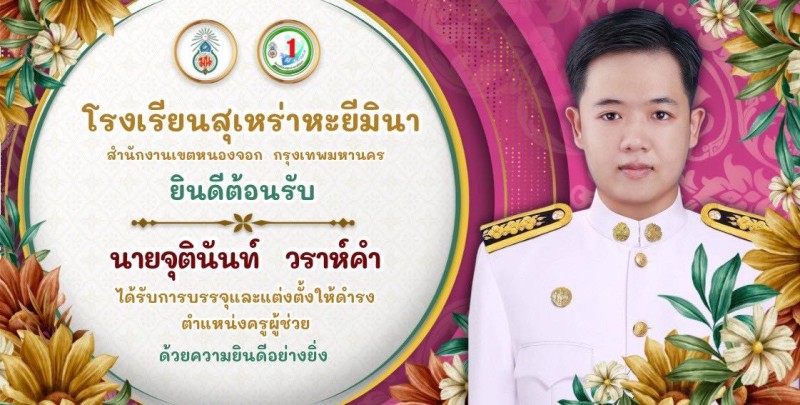 ขอแสดงความยินดีและยินดีต้อนรับ ครูจุตินันท์ วราห์คำ (วิชาเอกประถมศึกษา) เนื่องในโอกาสได้รับการบรรจุและแต่งตั้งให้ดำรงตำแหน่งครูผู้ช่วย