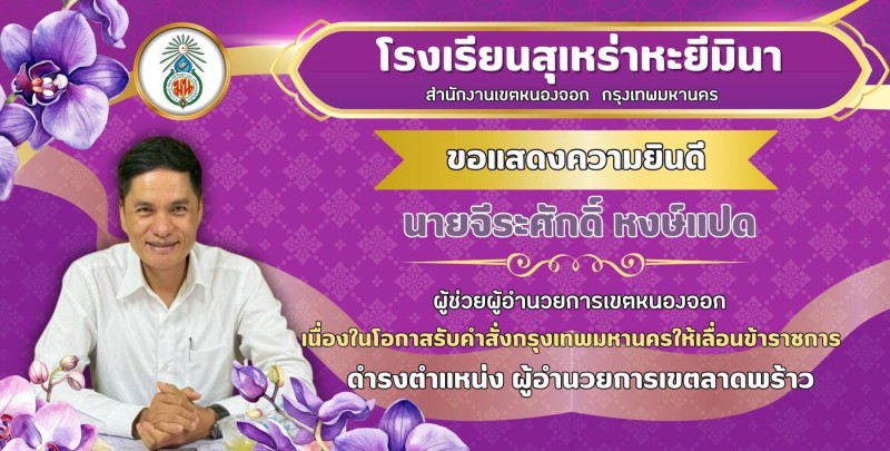 #โรงเรียนสุเหร่าหะยีมินา ขอแสดงความยินดีกับ นายจีระศักดิ์ หงษ์แปด ผู้ช่วยผู้อำนวยการเขตหนองจอก เนื่องในโอกาสรับคำสั่งกรุงเทพมหานครให้ดำรงตำแหน่ง ผู้อำนวยการเขตลาดพร้าว |
