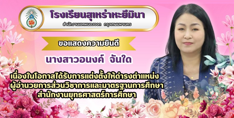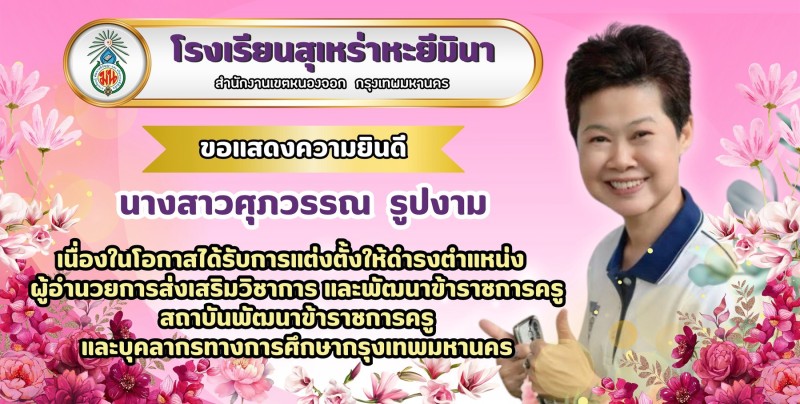 โรงเรียนสุเหร่าหะยีมินา ขอแสดงความยินดีกับนางสาวศุภวรรณ รูปงาม เนื่องในโอกาสได้รับแต่งตั้งให้ดำรงตำแหน่งผู้อำนวยการส่งเสริมวิชาการ และพัฒนาข้าราชการครู สถาบันพัฒนาข้าราชการครู และบุคลากรทางการศึกษากรุงเทพมหานคร
