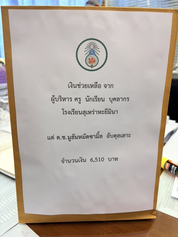 ร่วมมอบกำลังใจเป็นเงินที่ได้รับการสสนับสนุนจาก ผู้บริหาร ครู นักเรียน บุคลากร ให้กับครอบครัว ด.ช.มูฮำหมัดซามิ้ล อับดุลเลาะ ที่พ่อเสียชีวิต