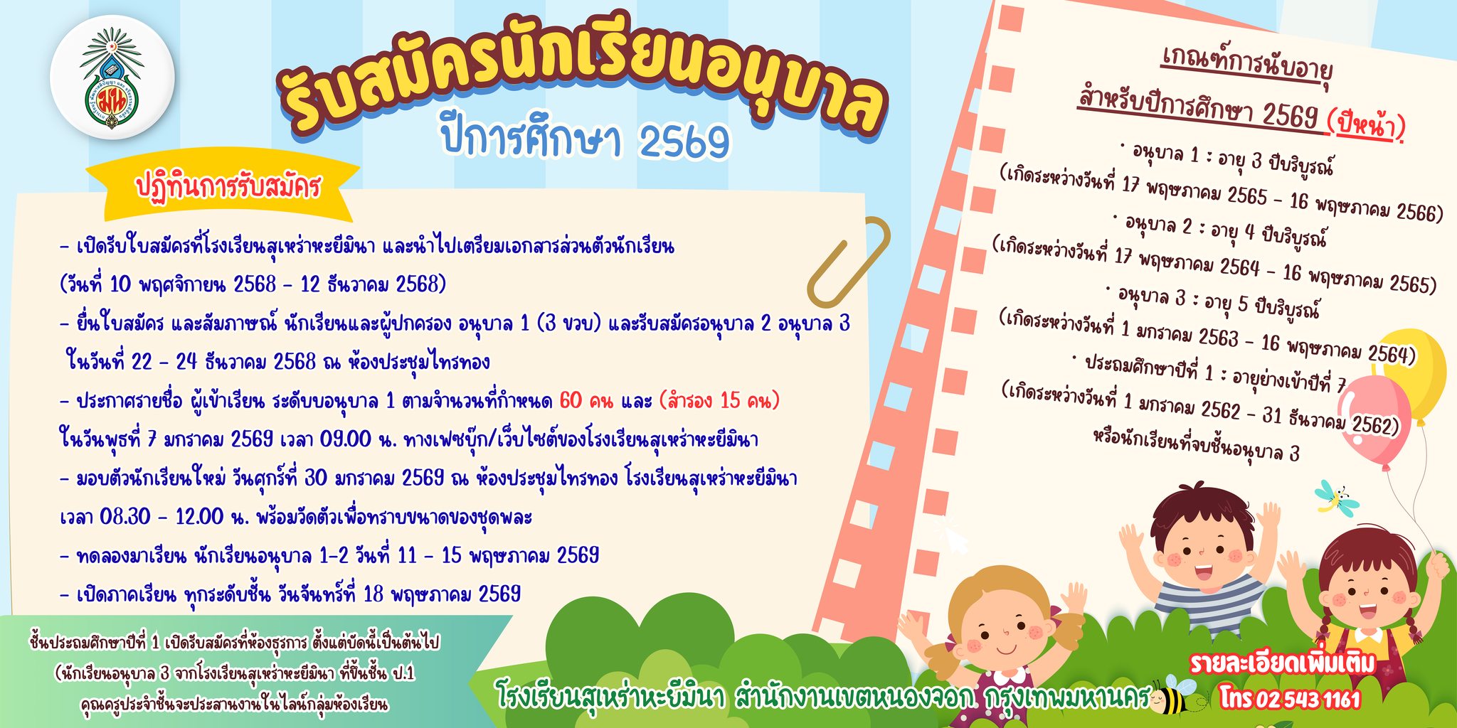 | รายชื่อนักเรียนระดับอนุบาล 1 ปีการศึกษา 2569 ....ขอให้ผู้ปกครองนักเรียนติดตามข่าวสารของโรงเรียนในไลน์กลุ่มอีกทางด้วยค่ะ........ทั้งนี้ยังสามารถรับนักเรียนอนุบาล1 (อายุ 3 ขวบ)เพิ่มเติมให้ครบตามจำนวนได้ |